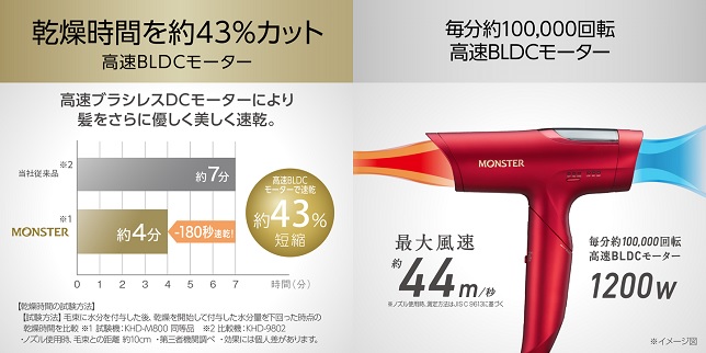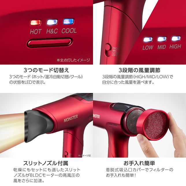 モンスターシリーズにおいて、高い速乾性(風速・風圧)と小型化・軽量化を実現しています。