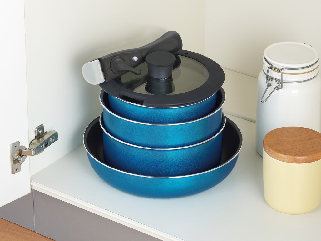ライトブルーのボディが爽やかなIH対応の鍋セットです。