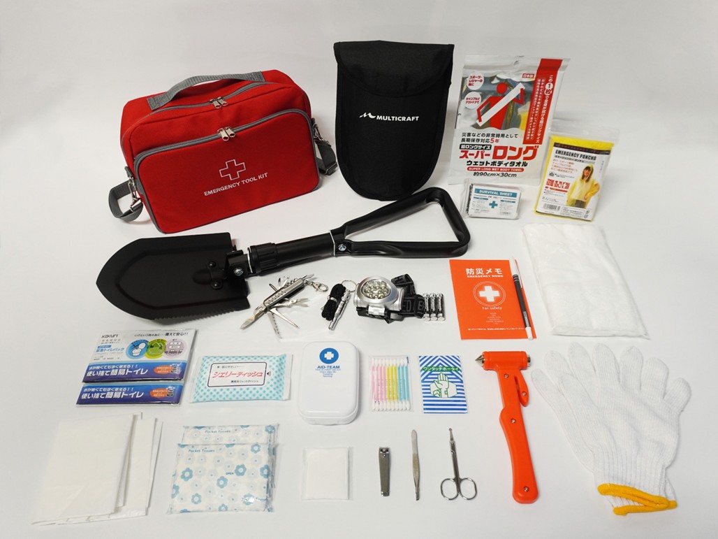 | 内容量 | エマージェンシーバッグ・緊急脱出ハンマー・折りたたみスコップ・10LEDヘッドライト・ミニ14徳ツール・IDホイッスル・サバイバルシート・ポンチョ・フェイスタオル・軍手・ウェットティッシュ・スーパーロングウェットボディタオル・ワンタッチ包装・爪切り・毛抜き・ハサミ・防災メモ・ボールペン 各1個、緊急トイレパック・ポケットティッシュ・取手付ゴミ袋 各2個、コットンパフ 3個、綿棒 10個 |