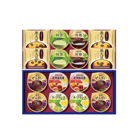 ●商品内容/冬のぜんざい50g×4、宇治抹茶プリン・沖縄県産黒糖くずもち 各57g×2、山形県産ラ・フランス果汁使用ゼリー・和歌山県産紀州南高梅ゼリー 各62g×2、黒大豆パウンドケーキ4個