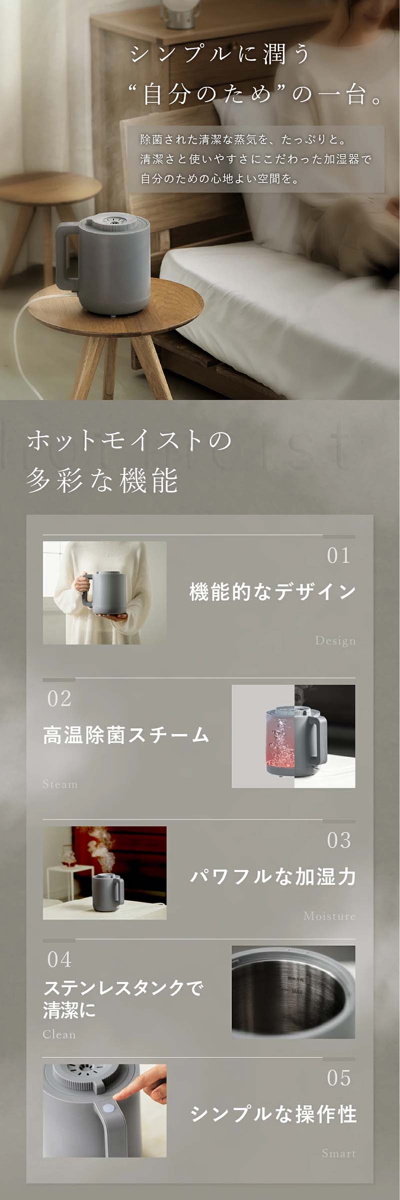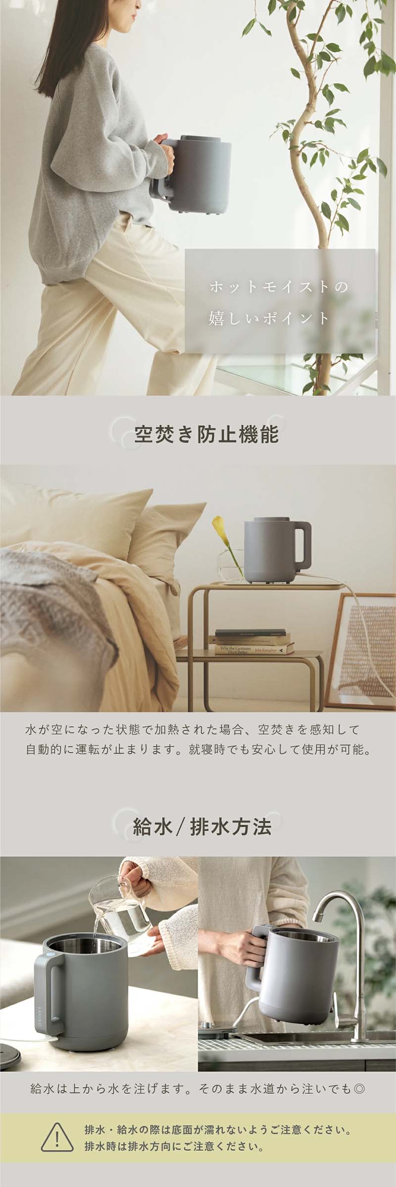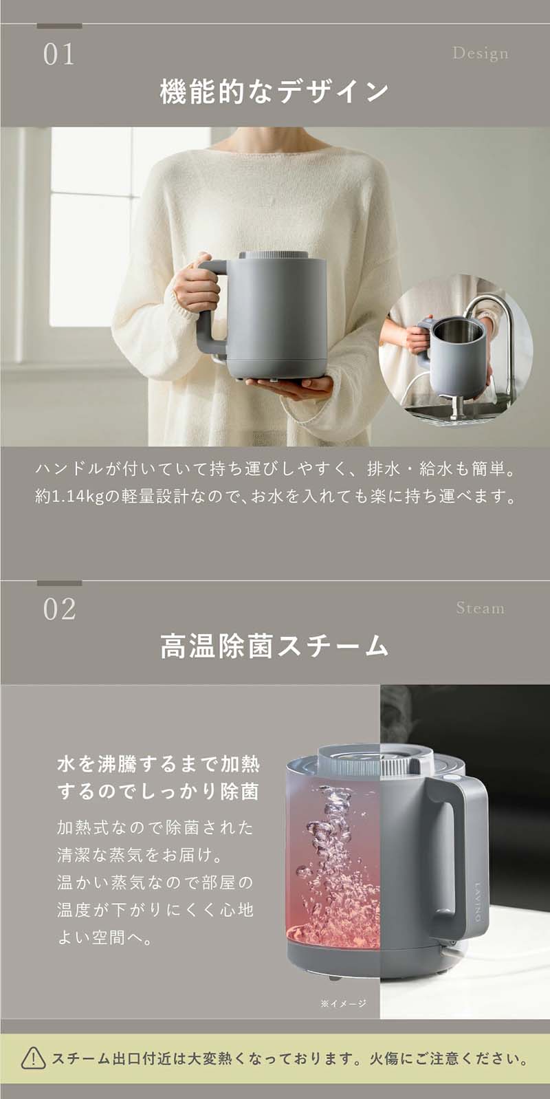 | 注意事項/留意事項 | 100℃沸騰による蒸気が出るため、噴出口部における火傷に注意ください。 その他、注意事項は説明書に記載しております。 |