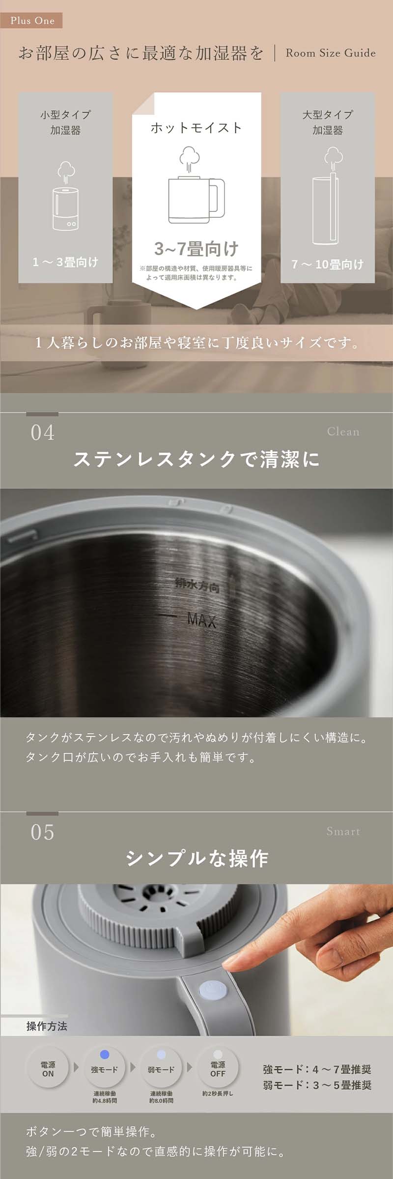 最大連続使用時間は、8時間で寝ている間中加湿できます。