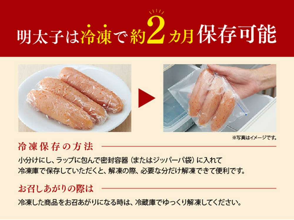 明太子は冷凍で約2ヶ月間保存いただけます。食べる分だけを冷蔵庫でゆっくり解凍してお召し上がりください。