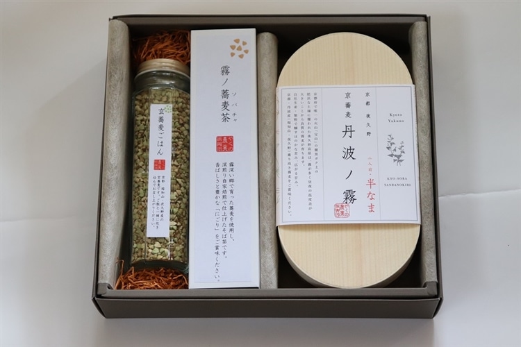 | 内容量 | ○半なま 京蕎麦 丹波ノ霧(木製わっぱ入り) 半なま麺80g×2袋(2人前) 濃縮タイプ 特製つゆ 25ml×2袋 ○霧ノ蕎麦茶 ティーバッグ入り7g×7包 ○玄そばごはんの素 130g×1個 |