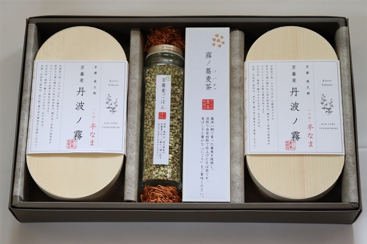 | 内容量 | ○半なま 京蕎麦 丹波ノ霧(木製わっぱ入り) 半なま麺80g×4袋(4人前) 濃縮タイプ 特製つゆ 25ml×4袋 ○霧ノ蕎麦茶 ティーバッグ入り7g×7包 ○玄そばごはんの素 130g×1個 |