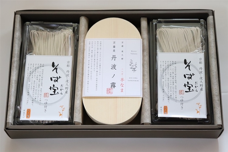 | 内容量 | ○半なま 京蕎麦 丹波ノ霧(木製わっぱ入り) 半なま麺80g×2袋(2人前) 濃縮タイプ 特製つゆ 25ml×2袋 ○半なま そば宝 半なま麺80g×4袋(4人前) 濃縮タイプ 特製つゆ 25ml×4袋 |