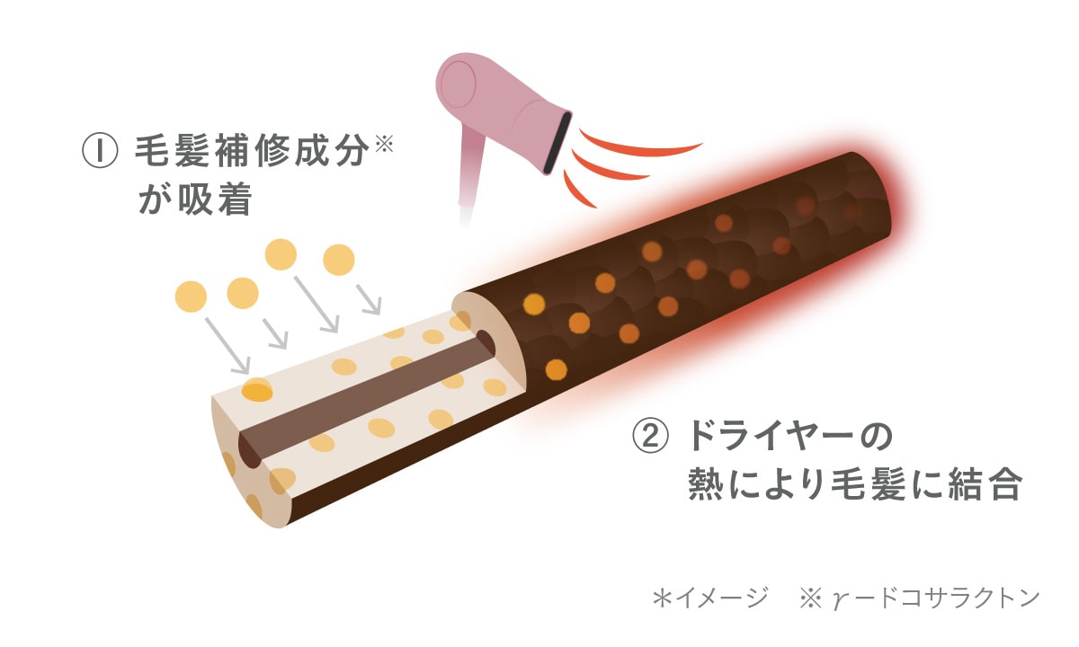 髪補修成分(γードコサラクトン)がドライヤーの熱により毛髪に結合して、ダメージ部分に吸着してキューティクルを補修。髪表面をなめらかに整えます。