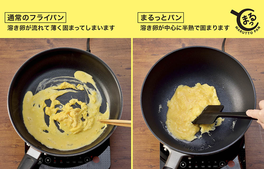 通常のフライパンでは、玉子が薄く流れて固まり「スクランブルエッグ」や「薄焼き玉子」になる事も。