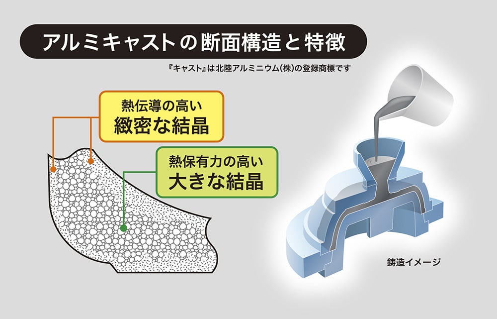 その独特な結晶組織は溶解状態のアルミが金型へ鋳造され自然に硬化する過程で形成されます。