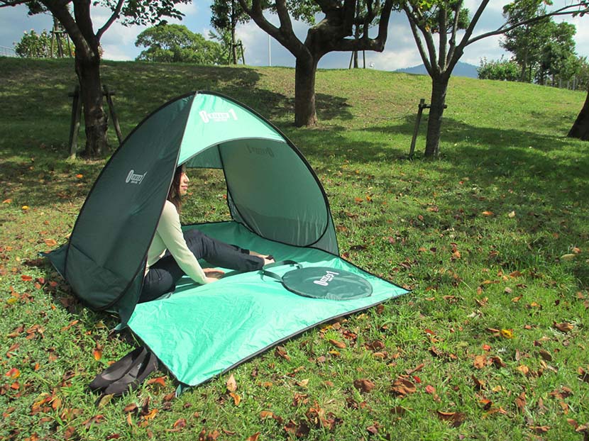 簡単設置のワンタッチ式でレジャー等の様々なシーンで日よけ・雨よけ・荷物置きと大活躍です。