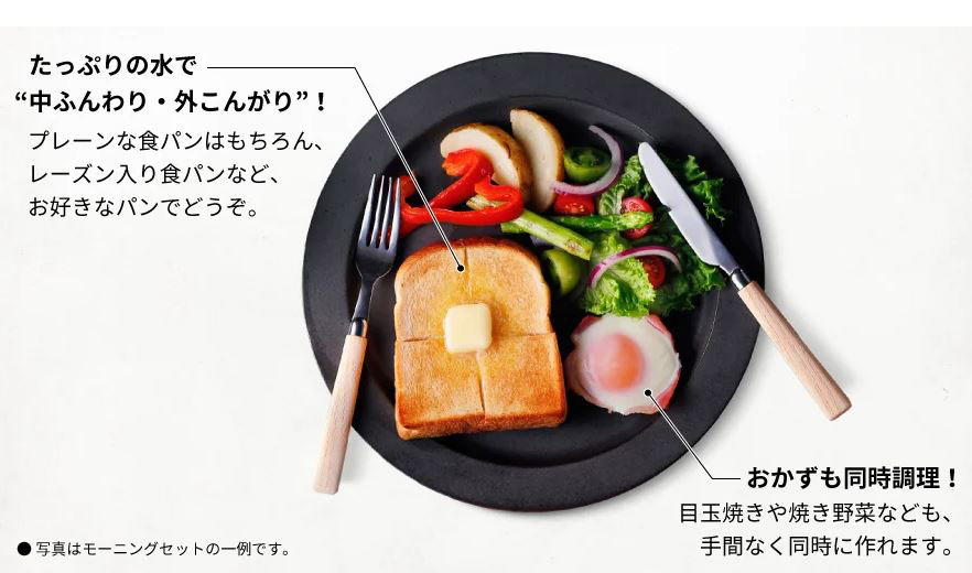 フライパンを使わずに、目玉焼きや焼き野菜などもトーストと同時に調理できるので、手間なくおいしい朝食の一皿が食べられます。