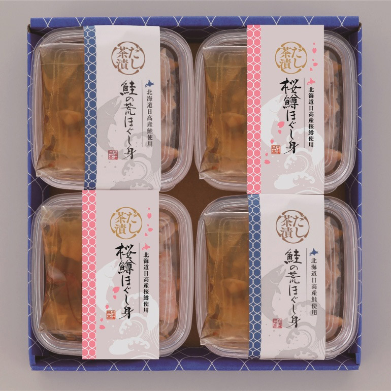 | 内容量 | 秋鮭のだし茶漬け60g(ほぐし身40g、だしつゆ20g)×2、桜鱒のだし茶漬け60g(ほぐし身40g、だしつゆ20g)×2 |