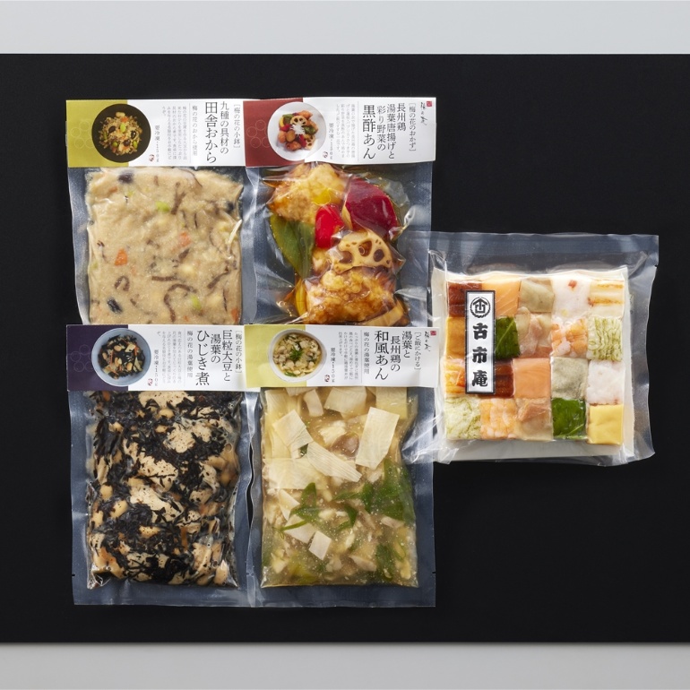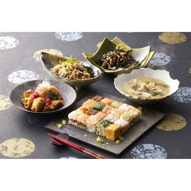 | 内容量 | なみはや寿司(鯖、海老、サーモン、穴子、鯛、昆布、カニ、大根酢〆、高菜×各2、玉子×1、玉子焼き×1(ごはん無し))×1、九種の具材の田舎おから煮150g×1、巨粒大豆と湯葉ひじき煮150g×1、湯葉と長州鶏の和風あん150g×1、長州鶏湯葉唐揚げと彩り野菜の黒酢あん150g×1 |