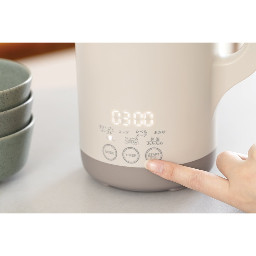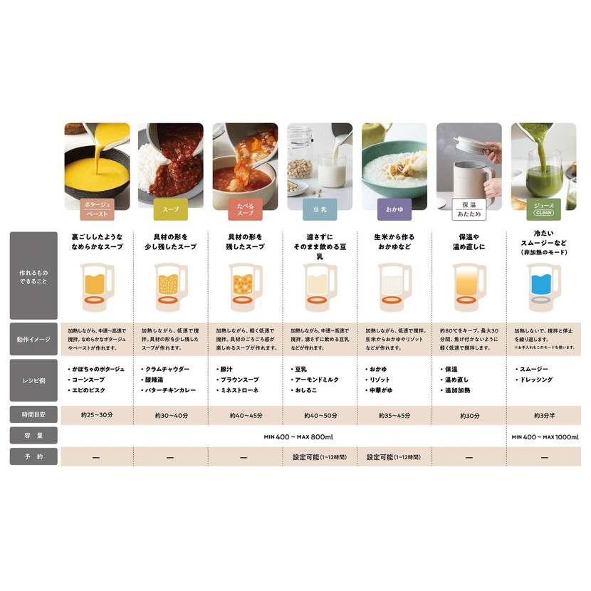 これにより、【ポタージュ/ペースト】 【スープ】 【たべるスープ】 【豆乳】 【おかゆ】 【ジュース/CLEAN 】 【保温/あたため】の7つのモードを搭載し、多彩なメニューに対応します。