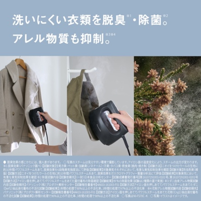※1 脱臭効果(当社調べ) 【試験対象】生乾き臭・ペット臭・加齢臭(ノネナール)・汗臭・タバコ臭・飲食臭(焼肉・焼き魚) 【試験方法】ニオイをつけたウールの生地に約10秒間パワフルスチームをあて、脱臭効果を6段階臭気強度法にて評価 【試験結果】対象臭気それぞれにおいて、有意な臭気抑制効果を確認 【試験対象】防虫剤臭(樟脳) 【試験方法】ニオイをつけたウールの生地に約10秒間パワフルスチームをあて、脱臭効果をガスクロマトグラフィー質量分析法にて評価 【試験結果】対象臭気において、有意な臭気抑制効果を確認