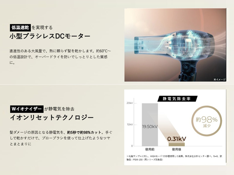 さらに「イオンリセットテクノロジー」を搭載し、髪のイオンバランスを整え、静電気によるパサつきや広がりを防ぎます。