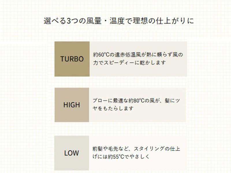 選べる3つの風量・温度で理想の仕上がりに
