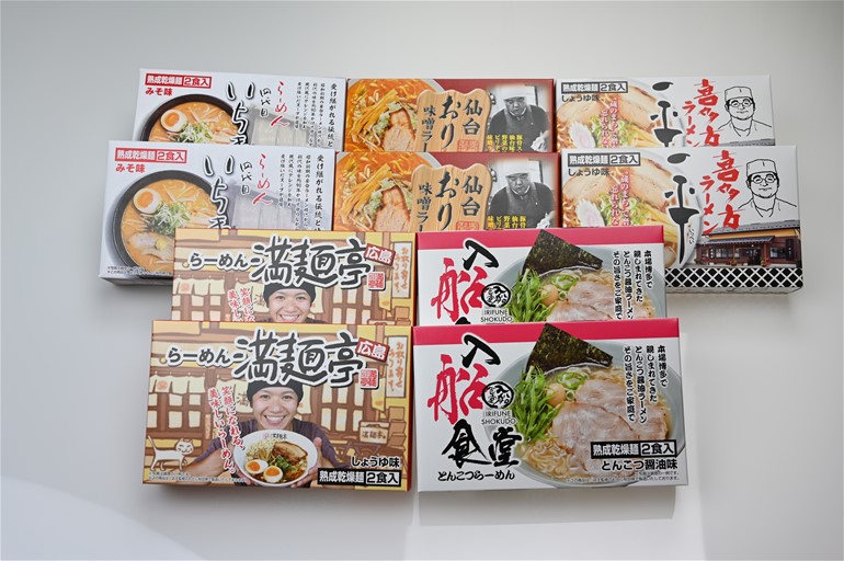 | 内容量 | 札幌「四代目いちまる」味噌味×2箱(1箱あたり麺70g×2、スープ50g×2入)、仙台「おり久」辛みそ味×2箱(1箱あたり麺70g×2、スープ35g×2入)、喜多方「一平」醤油味×2箱(1箱あたり麺70g×2、スープ40g×2入)、広島「満麺亭」醤油味×2箱(1箱あたり麺70g×2、スープ45g×2入)、博多「入船食堂」とんこつ味×2箱(1箱あたり麺70g×2、スープ50g×2入) |