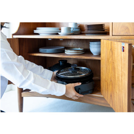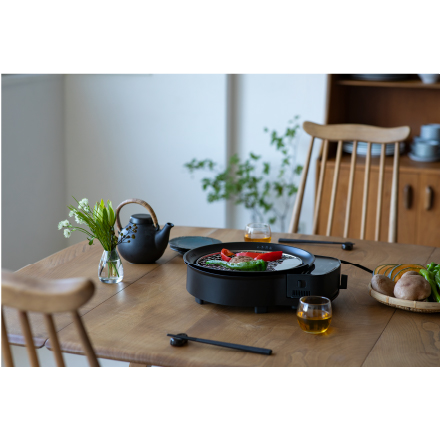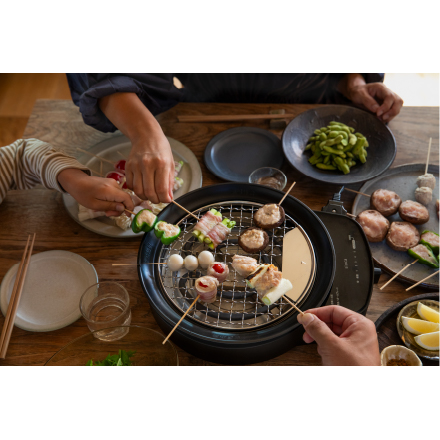 卓上で焼いて、熱々を。 焦げ付きにくい網と減煙設計で 手軽におうち炉ばたを実現