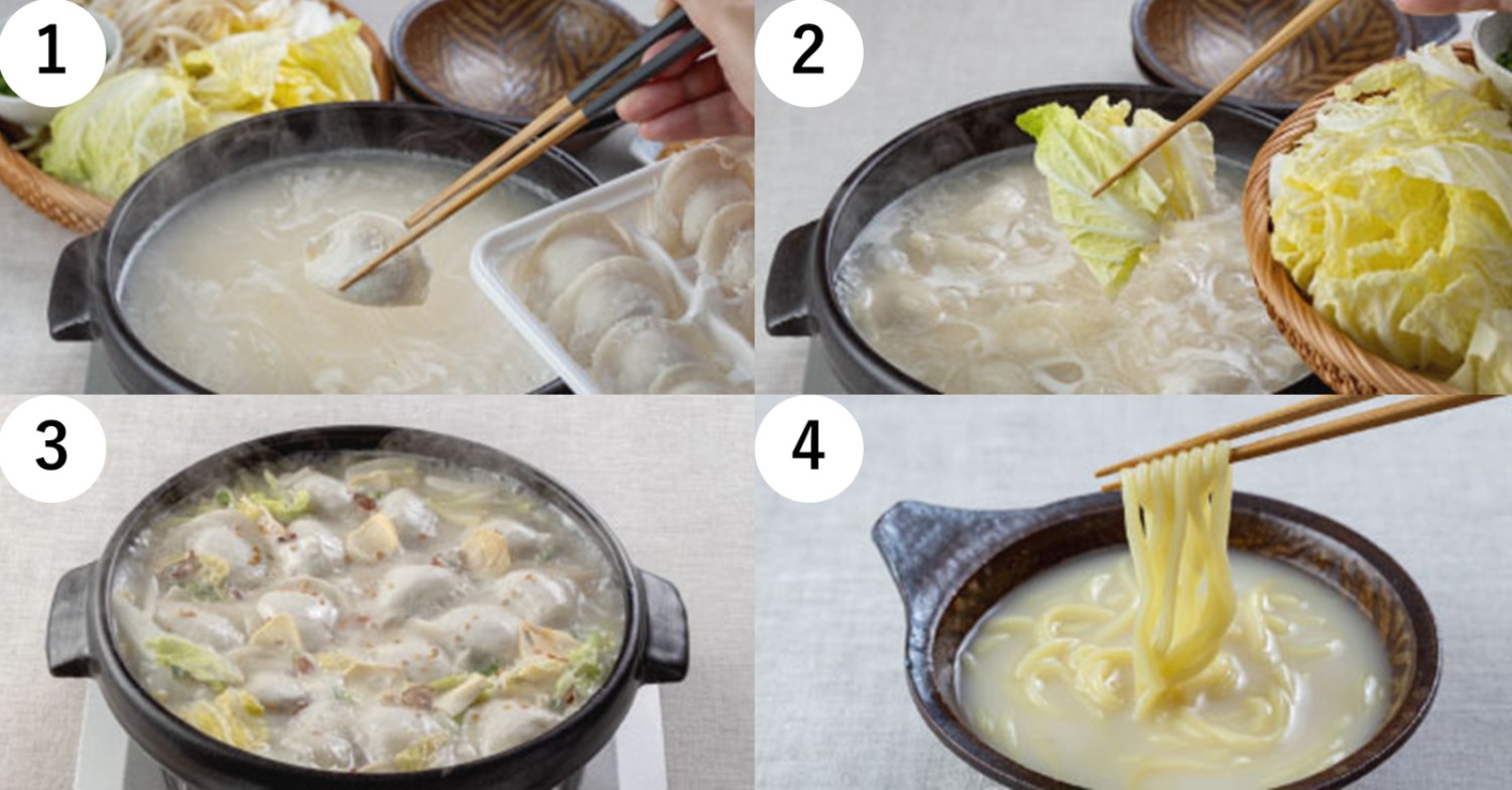 ④ 〆には付属のちゃんぽん麺を入れてください。(麺は自然解凍してください。)3~5分煮たら食べごろです。