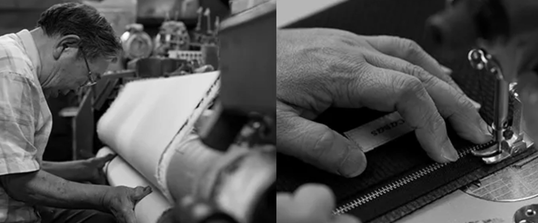 刺し子織りの老舗メーカーとして歩み続けてきたタネイは、それまで手工業で行ってきた刺し子織りを、動力による織機を開発することで安定的に供給できることをいち早く可能にし、三河の地に刺し子織りを根付かせました。タネイは剣道や柔道などの武道着の発展に寄与し、今日も日本国内の道着のトップメーカーとして多くの道着を世に送り出しています。厚手の三河木綿を使った独特な刺し子織りは、生地の凸凹により耐久性、耐火性、保温性、吸湿性に優れ、肌触りもよく刺し子織りは日本古来より伝わる防火用衣の織りものとして伝わってきました。刺し子織りの生地は非常に頑丈なため、美しい裁断や縫製が難しいとされていますが、タネイによって生み出される商品は、昔から刺し子織りに向き合ってきた経験豊かな作り手によって真っすぐに裁ち揃えられ、一枚一枚丁寧に縫製することで美しいカバンを生み出だしています。
