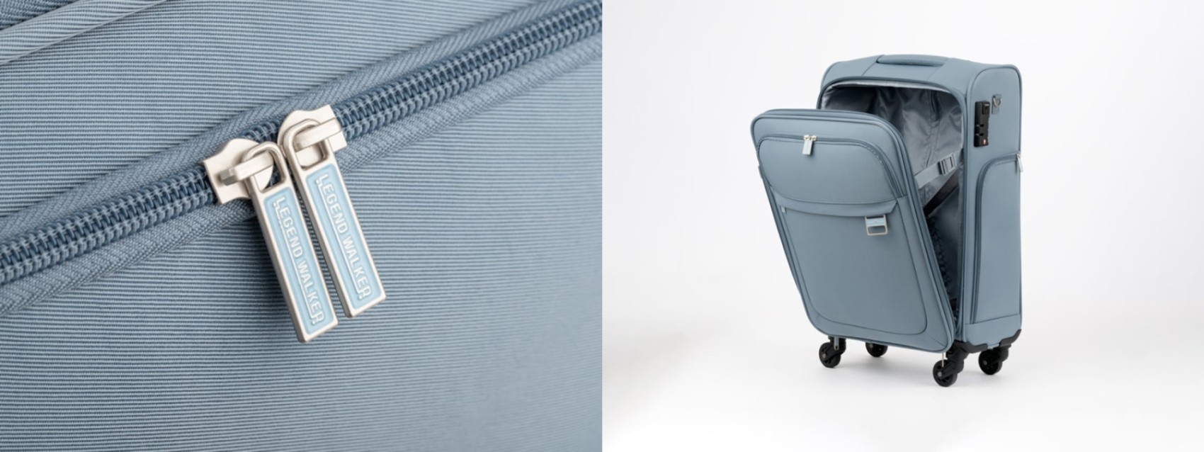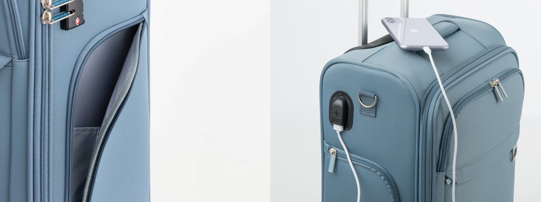 ワンタッチボタン式で簡単にキャスターを取り外してコインロッカーや機内持ち込みサイズに対応。USBポートやショルダーベルトなども装備した柔らかな色合いのソフトキャリー。
