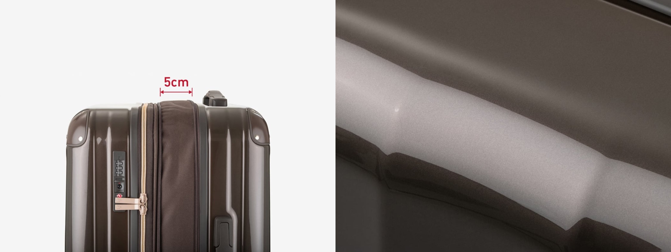 ファスナー操作でマチ幅が約5cmアップします。旅先での買い物などで荷物が増えても安心です。
