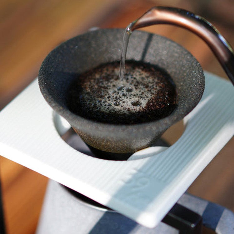 ④ーヒー豆全体が浸る程度のお湯をそそぎ込み20秒ほど豆を蒸らした後、ゆっくりと残りのお湯を5、6回に分けて抽出速度を調節してください。