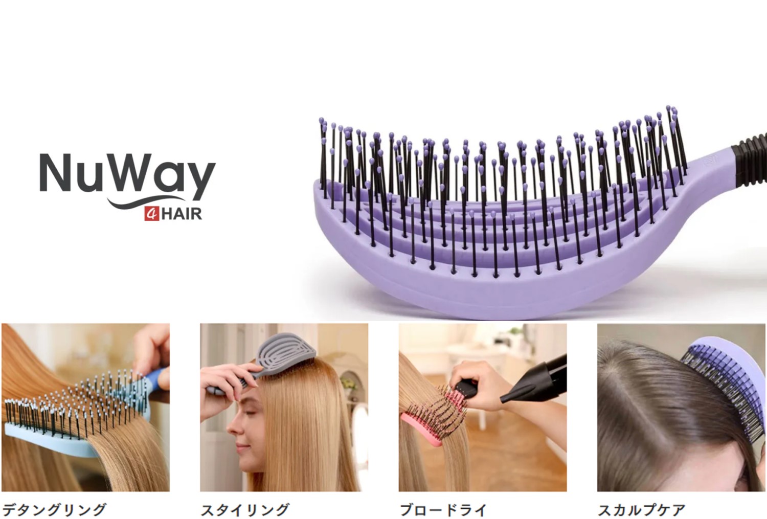「NuWayBrush(ニューウェイブラシ)」は、頭皮と髪にベストな状態で、ブラッシングできる技術を詰め込んだヘアブラシ。独自開発技術のBrainyBristles®(ブレイニーブリストル)が、一本のブラシでデタングリング、ブロードライ、スタイリング、スカルプケアの4役まで行えます。絡まりやすい細い髪や傷んだ髪、濡れた髪でも引っ張ることなくやさしくブラッシングし、触りたくなる髪を作り出します。
