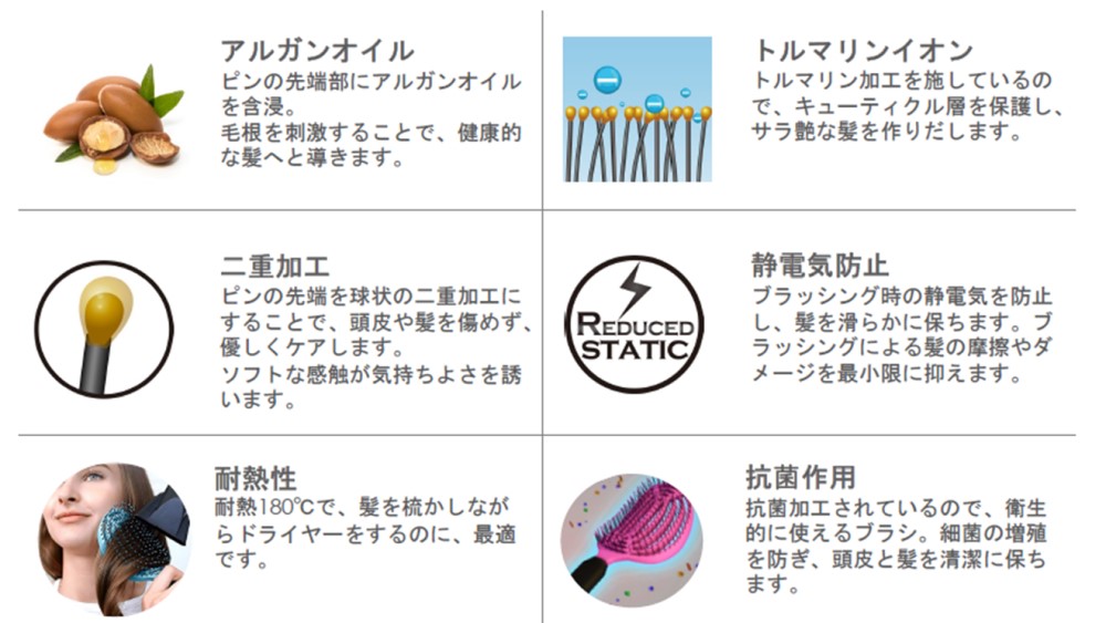 ピンの先端を球状の二重加工にすることで、頭皮やキューティクルのダメージを抑えます。頭皮に適度な刺激を与えることで、スカルプケアも実現しています。