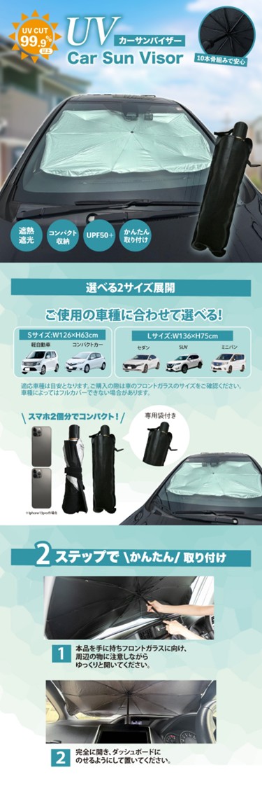 | 注意事項/留意事項 | ※画像はイメージです。実際の商品とは多少異なる場合があります。※商品の仕様は予告なく変更する場合があります。予めご了承ください。※適応車種は目安となります。ご購入の際は車のフロントガラスのサイズをご確認ください。車種によってフルカバーできない場合があります。 |