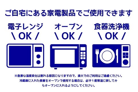 ※急激な温度変化は割れる原因になりますので、直火でのご利用はご遠慮ください。冷蔵庫に入れた食器をオーブンで使用する場合は、必ず1度常温に戻してからオーブンに入れるようにしてください。