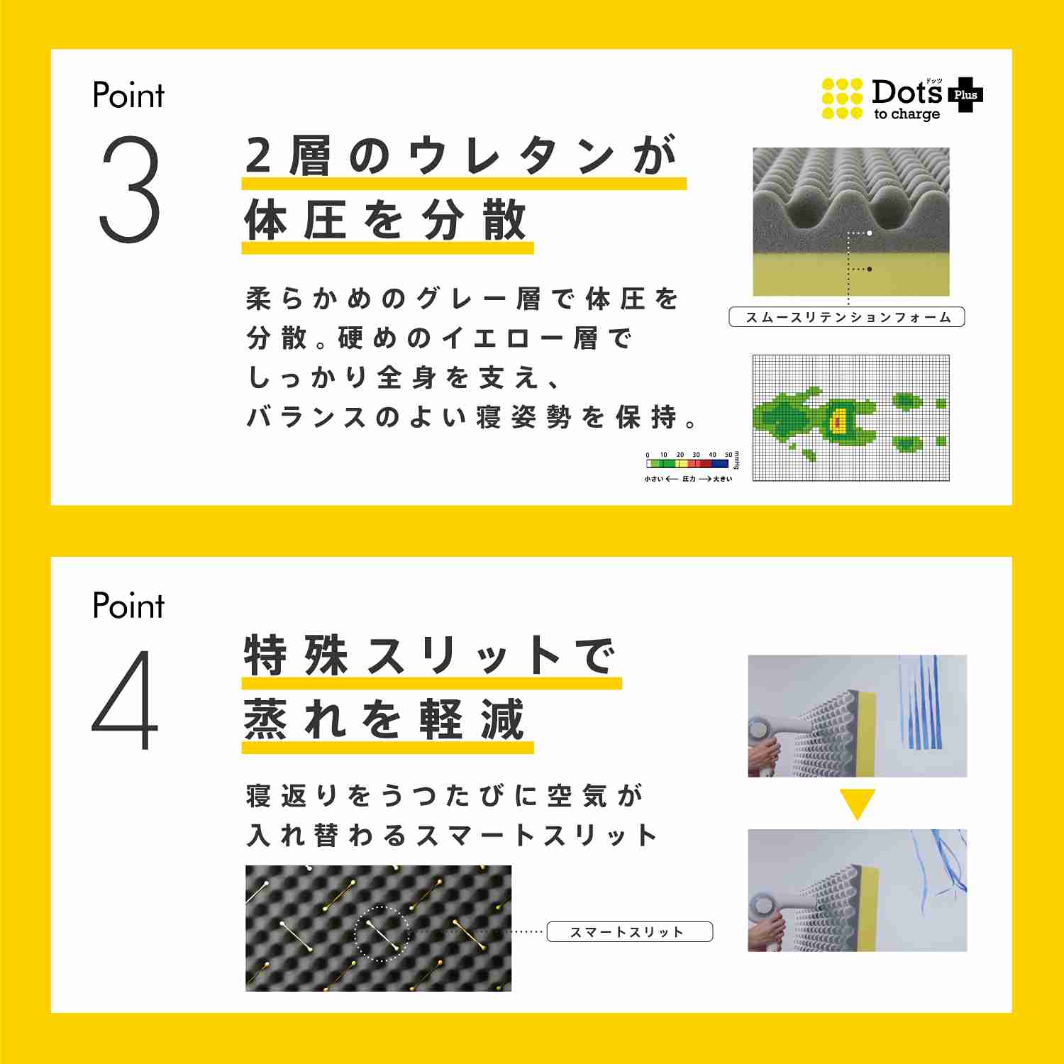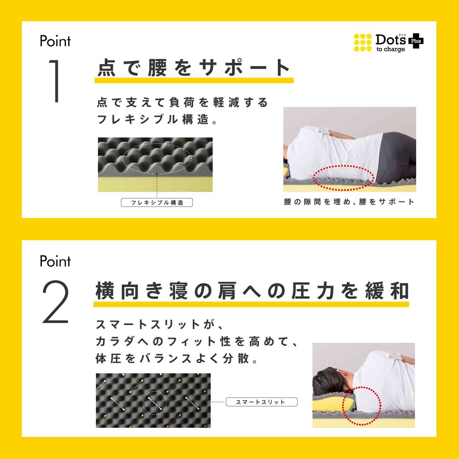 柔らかめのグレー層で体圧を分散。硬めのイエロー層でしっかり全身を支え、 バランスのよい寝姿勢を保持。