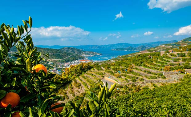 リアス式海岸の傾斜地に続く段々畑で降り注ぐ太陽と、穏やかな宇和海に包まれて甘くておいしいみかん・かんきつが育ちます。