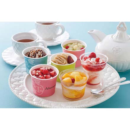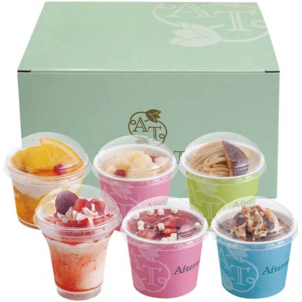 | 内容量 | 苺のパフェ80ml、スイートフルーツティーパフェ82ml、渋皮栗のモンブラン94ml×各1、洋梨とアールグレイ、苺とチーズ、ダブルチョコレート各103ml×各1(計6) |