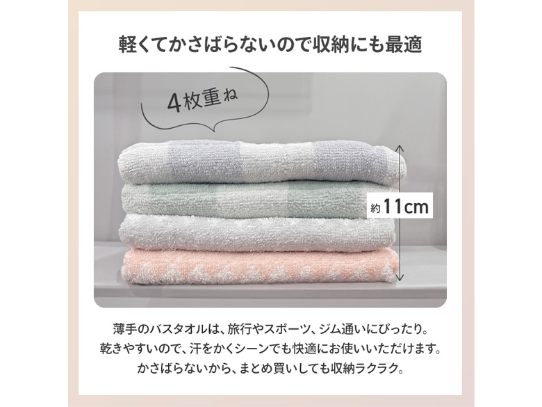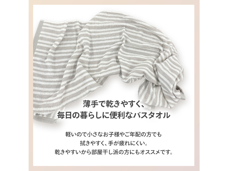 薄手で乾きやすく、毎日の暮らしに便利なバスタオルです。