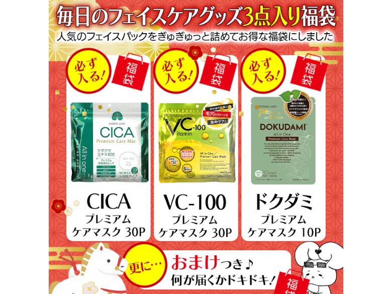 人気のフェイスマスク3点をまとめた福袋です。おまけつき!