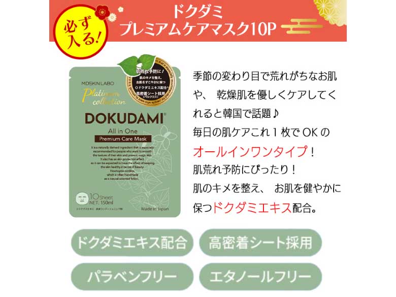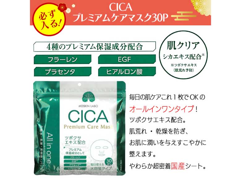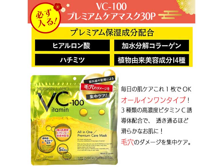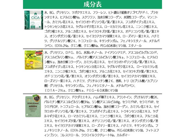 | 内容量 | ・CICAプレミアムケアマスク 30P ・VC-100プレミアムケアマスク 30P ・ドクダミプレミアムケアマスク 10P ・おまけ1点 ※おまけは当店お任せとなります。予めご了承ください。 |