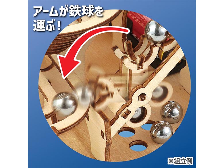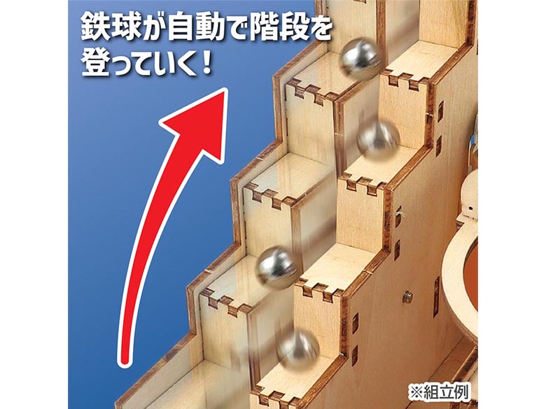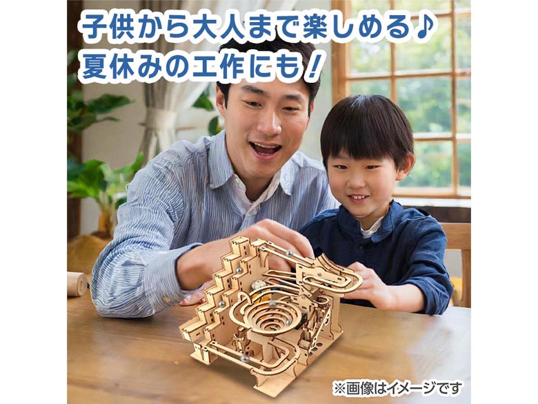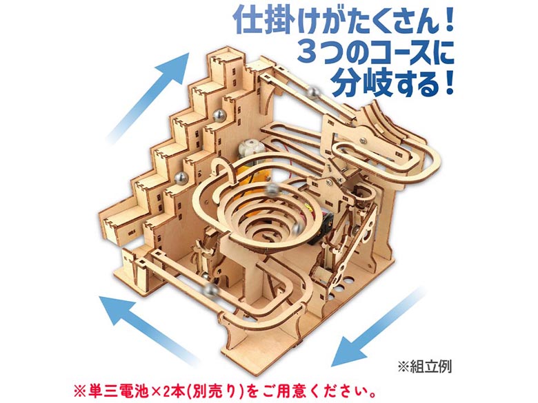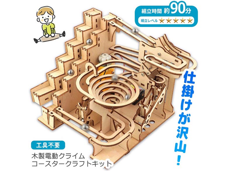 自動で動く木製コースター工作キットです。スイッチを入れるとボールがエレベーターで持ち上がり複数のコースをぐるぐる回ります。完成後は見ているだけでも楽しい動くインテリアにもなる工作キットです。
