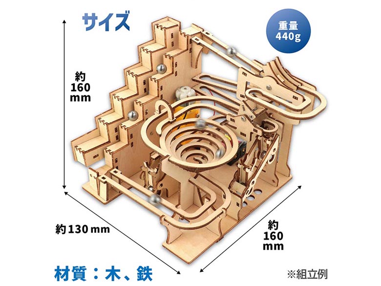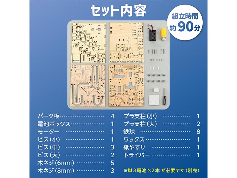 | 内容量 | 木製パーツ×4種、鉄球×8、モーター×1、電池ボックス×1、ドライバー×1、ろう×3、やすり×1、ねじ |