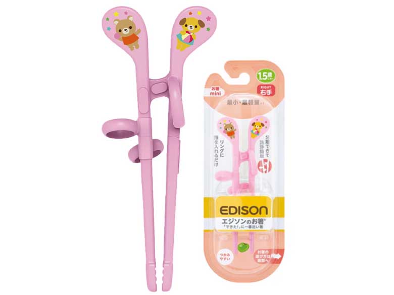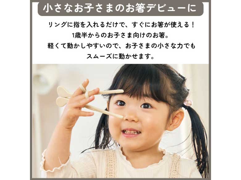 エジソンのお箸シリーズの中で、いちばん小さく軽いお箸なので、1歳半頃の手の小さなお子さまでも、リングに指を入れるだけでその日からお箸が上手に使えます。