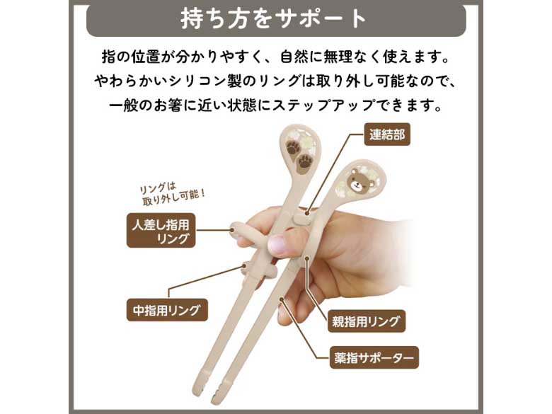 ・指の位置が分かりやすく、自然に無理なく使うことができるお箸です。やわらかいシリコン製のリングは、取り外し可能なので、一般のお箸に近い状態にステップアップすることができます。