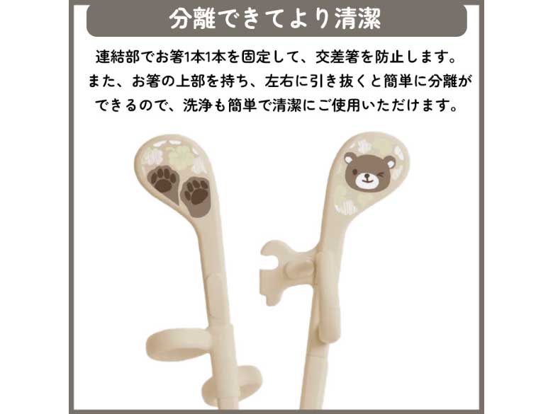・連結部で1本1本のお箸を固定して、交差を防止します。また、お箸の上部を持ち、左右に引き抜くと簡単に分離ができるので、洗浄も簡単でより清潔にご使用いただけます。