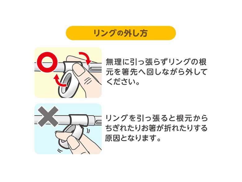 | 原材料/素材/材質 | お箸本体:ABS樹脂(90C) リング:シリコーンゴム(170C) |