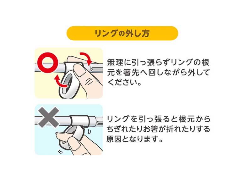 | 原材料/素材/材質 | お箸本体:ABS樹脂 (90℃) リング:シリコーンゴム (170℃) |