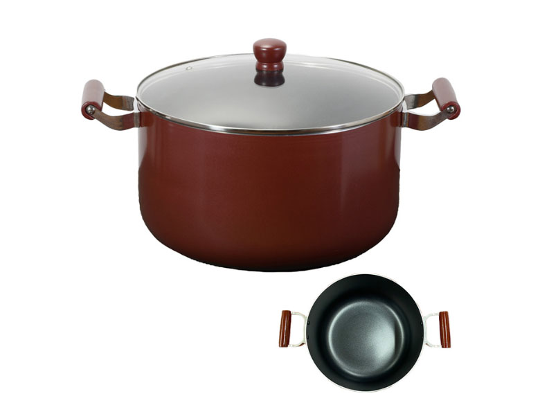 | 原材料/素材/材質 | 本体 表面加工/内面:ふっ素樹脂塗膜加工 外面:焼付け塗装 材料の種類/本体:アルミニウム合金(底の厚さ3.0㎜) はり底:ステンレス鋼(クロム16%)取っ手:天然木 蓋 品名/強化ガラス製器具、強化の種類/全面物理強化、縁リング:ステンレス鋼、つまみ:天然木 |
