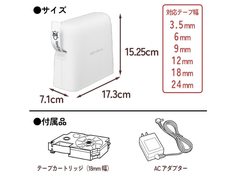 | 内容量 | 本体、テープカートリッジ(18mm幅)1本、ACアダプター、専用USBケーブル |