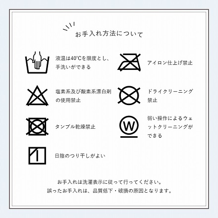 | その他詳細 1 | ●洗濯表示 液温は40℃を限度とし、手洗いができる。(洗濯機は使用できません) 干し方/日陰のつり干しがよい。 |