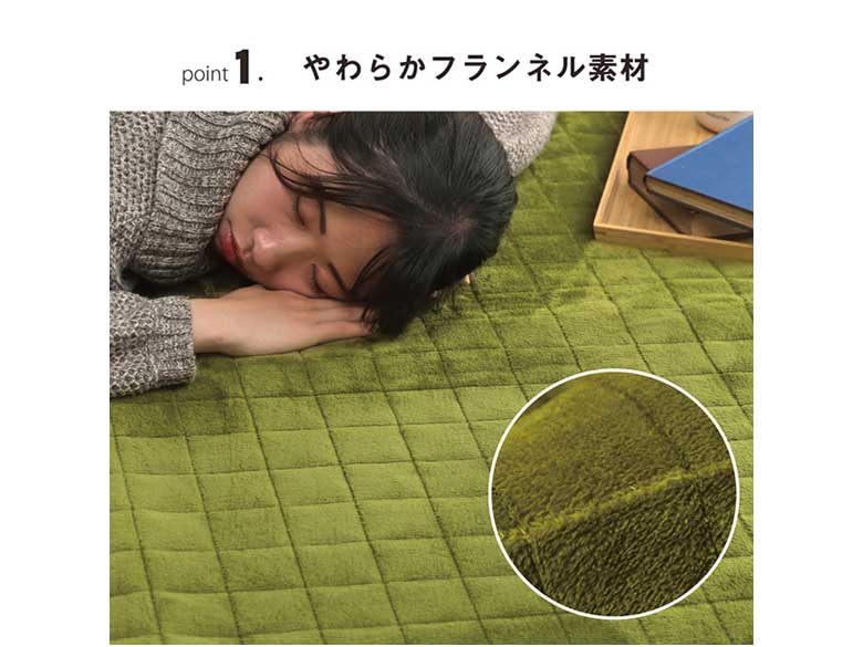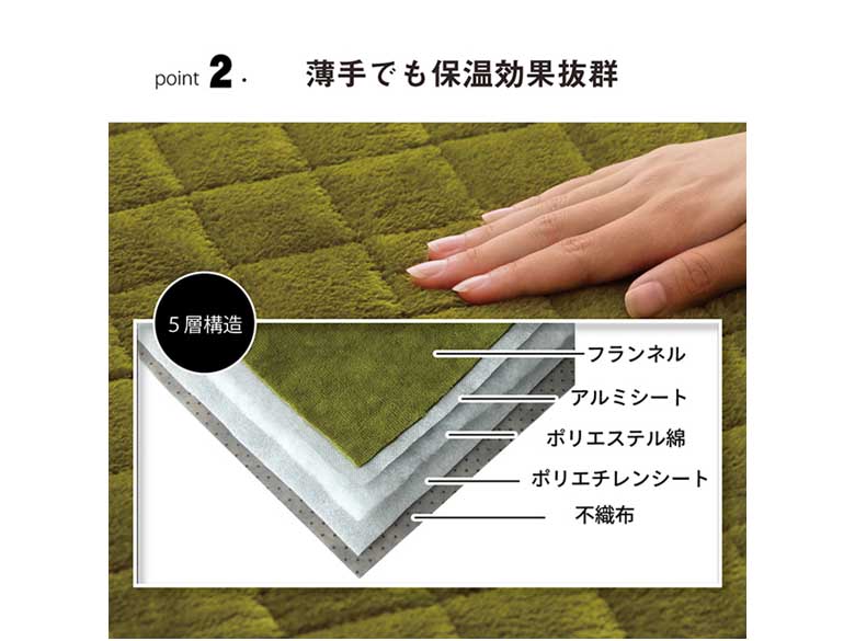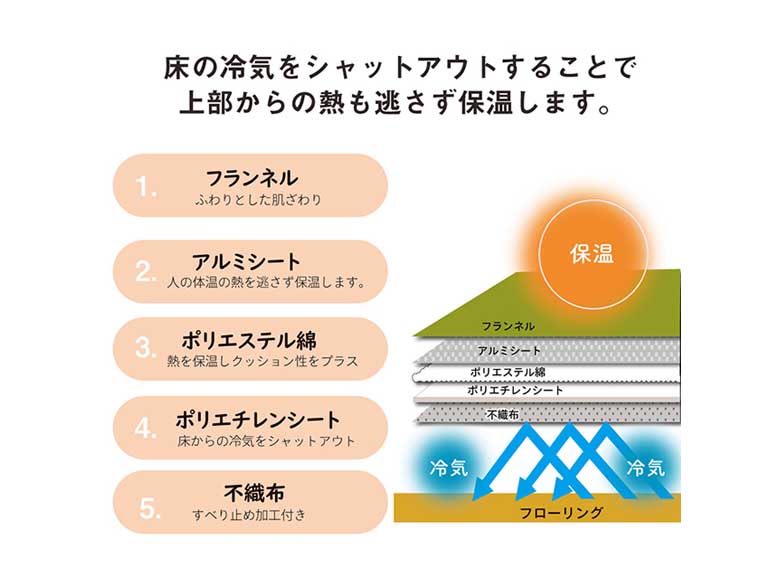 | 原材料/素材/材質 | 表地=ポリエステル100%【フランネル】 中材=アルミシート+ポリエステル綿+ポリエチレンシート3mm 裏地=ポリエステル100%【滑り止め付き】 |