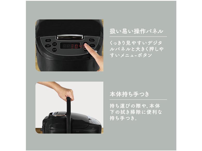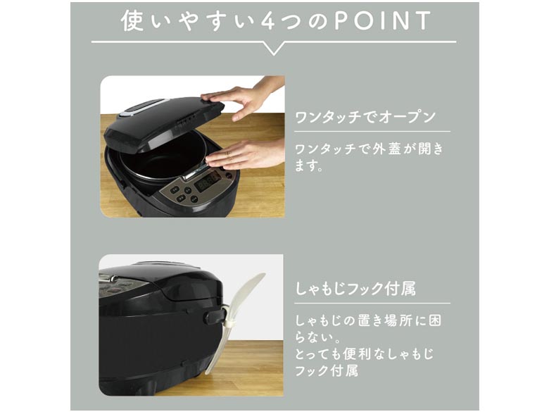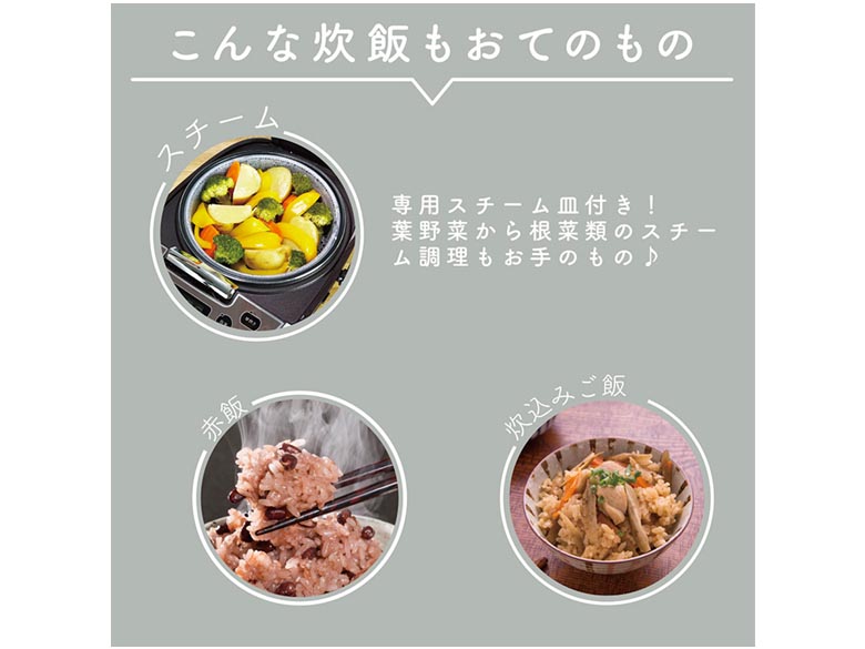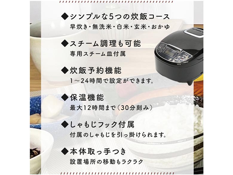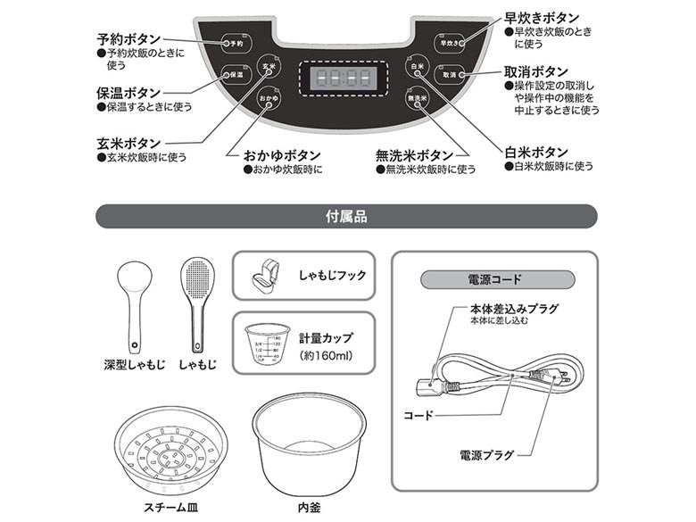 | 内容量 | 付属品 しゃもじ、深型しゃもじ、しゃもじフック、軽量カップ、スチーム皿、電源コード、取扱説明書兼保証書 |